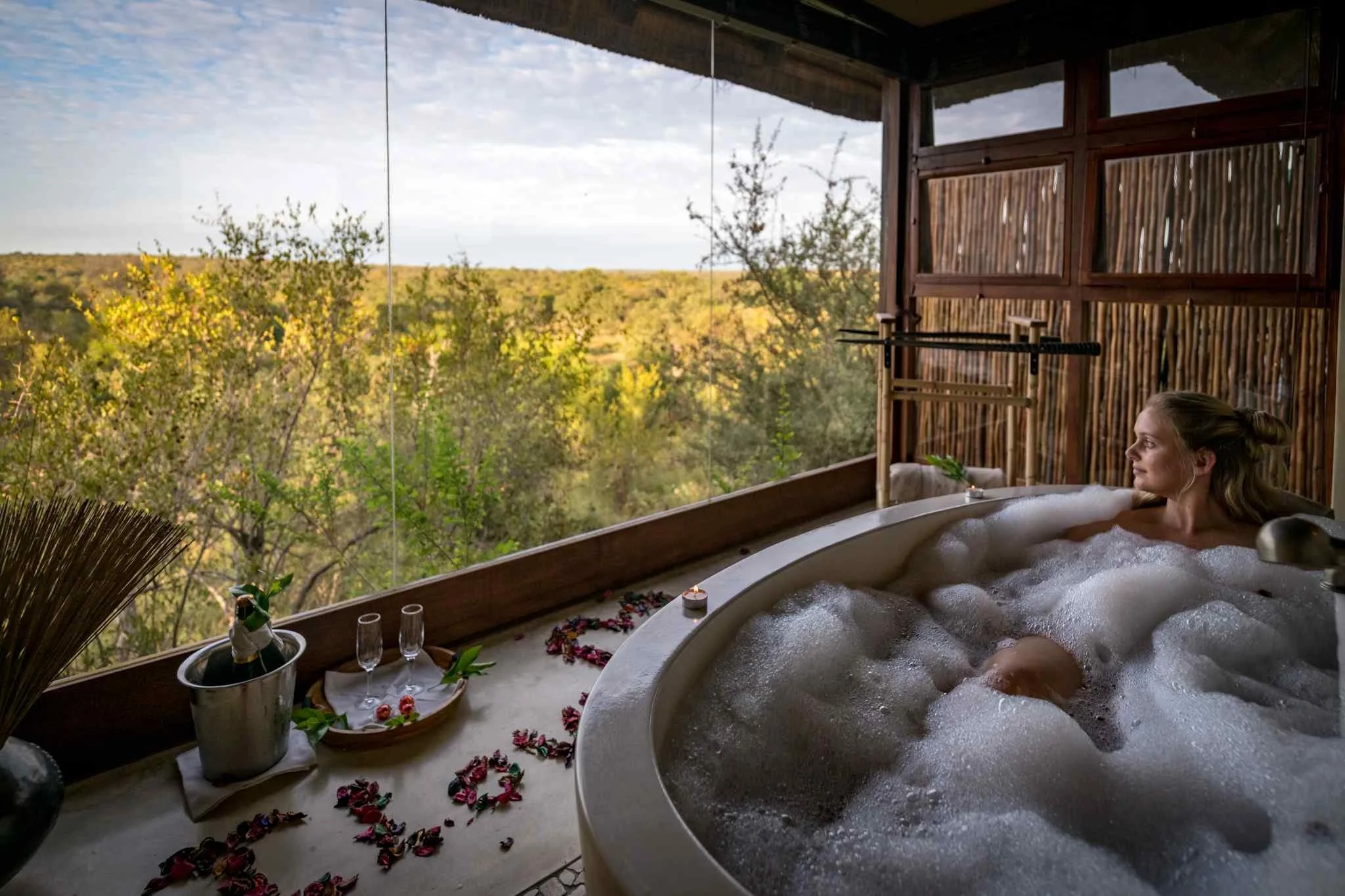 Select suites feature a perfectly positioned 'tub with a view,' allowing guests to soak while observing the untamed wilderness beyond their windows. Each suite extends to a private wooden deck equipped with a hammock, creating an ideal setting for afternoon relaxation as the sounds of the bush provide a natural soundtrack to the panoramic views.